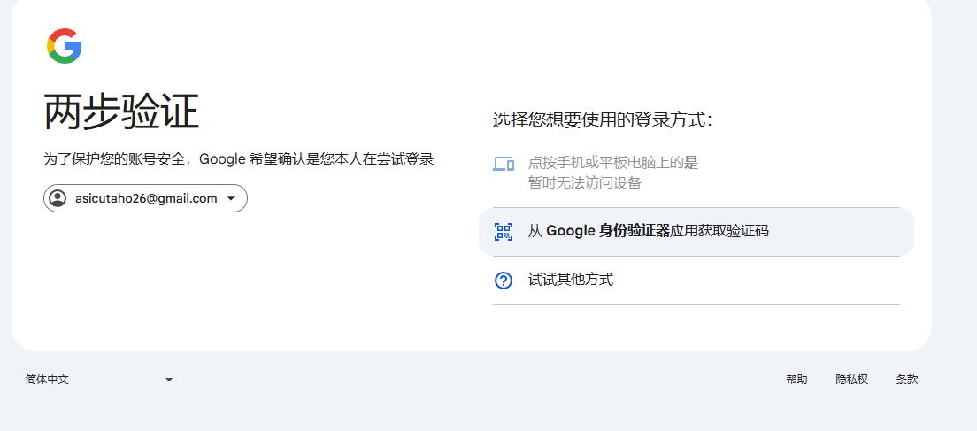 输入账号密码后,会跳身份验证器验证或者咱们手动选择Google身份验证器登录