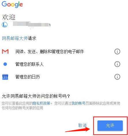 第四步,点击“允许”网易邮箱大师关联谷歌浏览器即可